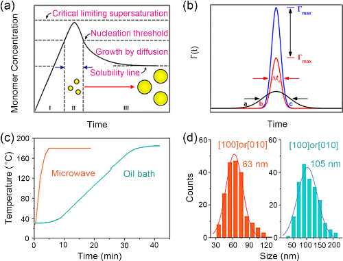 )對應形核時間窗口。(c)微波加熱和油浴加熱兩種加熱模式下的原位溫度與時間曲線。(d)由兩種不同的加熱模式制備的LiFePO4沿[100]或[010]方向的尺寸統(tǒng)計。微波加熱的尺寸為63nm,而在常規(guī)油浴加熱的情況下,尺寸為105nm。